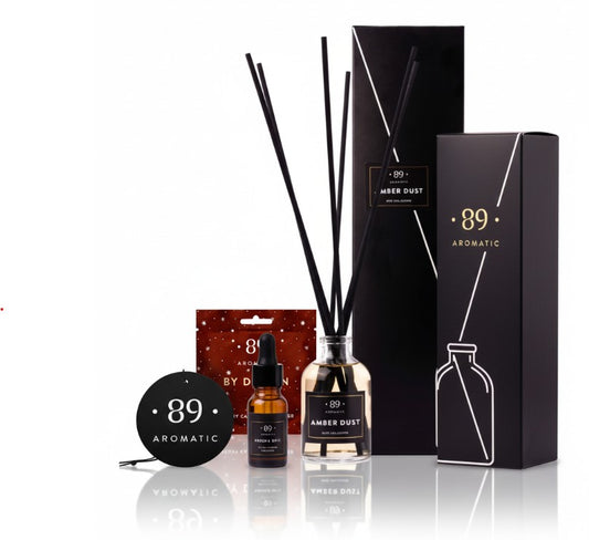 Rinkinys dovanų maišelyje: namų kvapas, nagų ir odelių aliejus, kabinamas popierinis oro gaiviklis