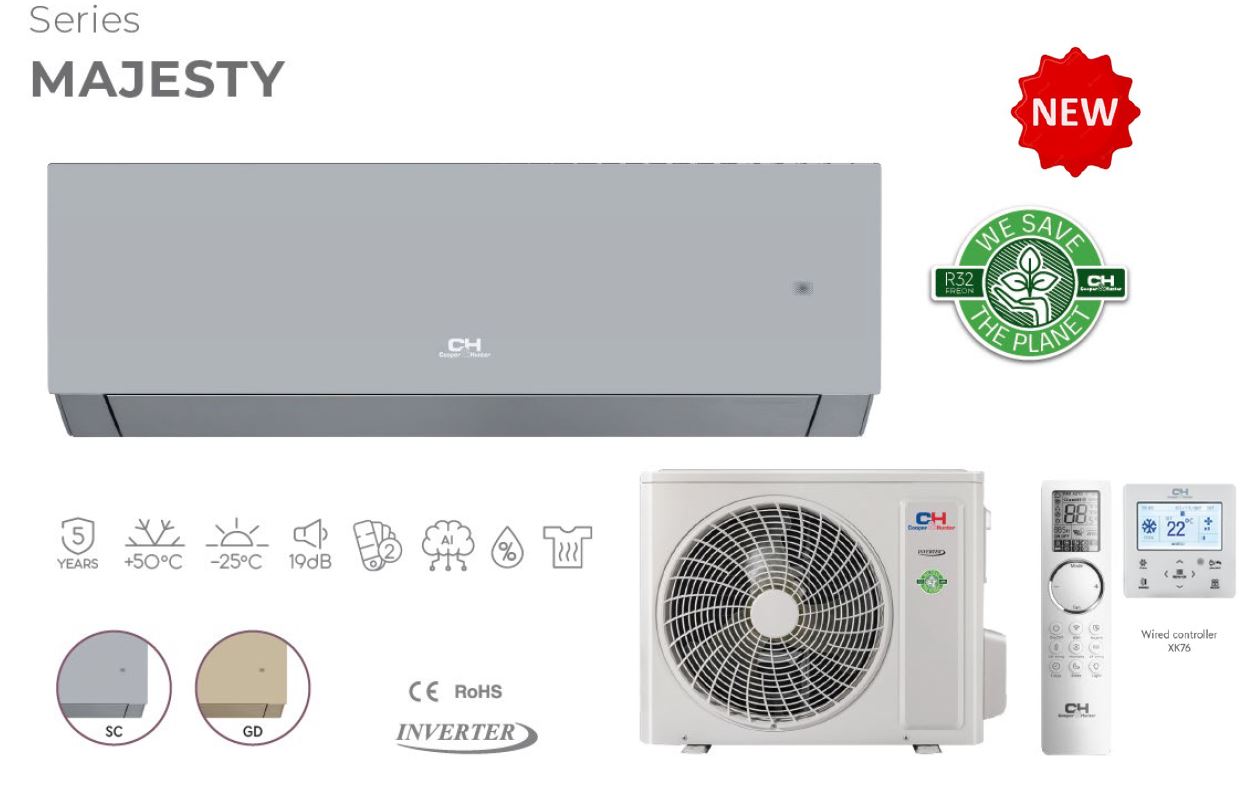 Cooper&Hunter pristato naujos kartos oro kondicionierių - šilumos siurblių seriją „Majesty“. Inverterinis kompresorius, leidžia tiksliau reguliuoti galią ir palaikyti stabilią patalpos temperatūrą. Oro kondicionierius veikia aplinkai ir ozonui nekenksmingu freonu R32 ir yra skirtas darbui aplinkos temperatūros diapazone nuo -25°C iki +50°C. Dėl to jis naudingas ištisus metus, užtikrinant patogias patalpų sąlygas tiek vasarą, tiek žiemą. Įrenginiuose naudojama dirbtinio intelekto technologija detaliai analizuoja aplinką ir leidžia idealiai pritaikyti nustatymus prie vartotojo poreikių. Sumanus drėgmės lygio valdymas, naujoviška „Double Self Clean“ valymo technologija ir UV lempos užtikrina švarų, sveiką orą ir optimalų komfortą taupant energiją.
