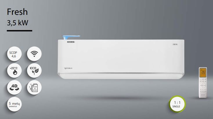 Dėl naujoviškos FRESH technologijos oro kondicionierius užtikrina patalpų oro mainus ir optimalią kokybę tiek temperatūros, tiek drėgmės atžvilgiu. Kondicionierius – puikus sprendimas patalpoms be mechaninio vėdinimo, kuriose po šiluminio modernizavimo gali trūkti gryno oro. Tiekiamo oro kokybę papildomai užtikrina trys įmontuotos LED UV lempos ir EPA E12 oro filtras.