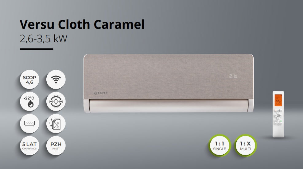 Rotenso Versu Cloth Caramel X – tai unikalus pasiūlymas sieninių oro kondicionierių segmente, susidedantis iš aukštos kokybės technologijų ir aukščiausios kokybės dizaino. Modernus stilius su keičiama karamelinio audinio plokšte leidžia sukurti darnias, elegantiškas interjero erdves. Įrenginys veikia žemiausiu – tik 19 dB – triukšmo lygiu , garantuojančiu nepertraukiamą komfortą, o aukščiausia A+++ energijos klasė leidžia efektyviai valdyti energijos suvartojimą.